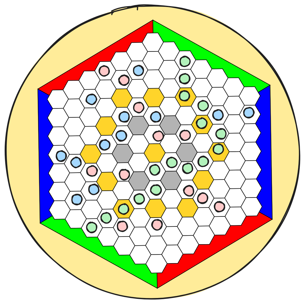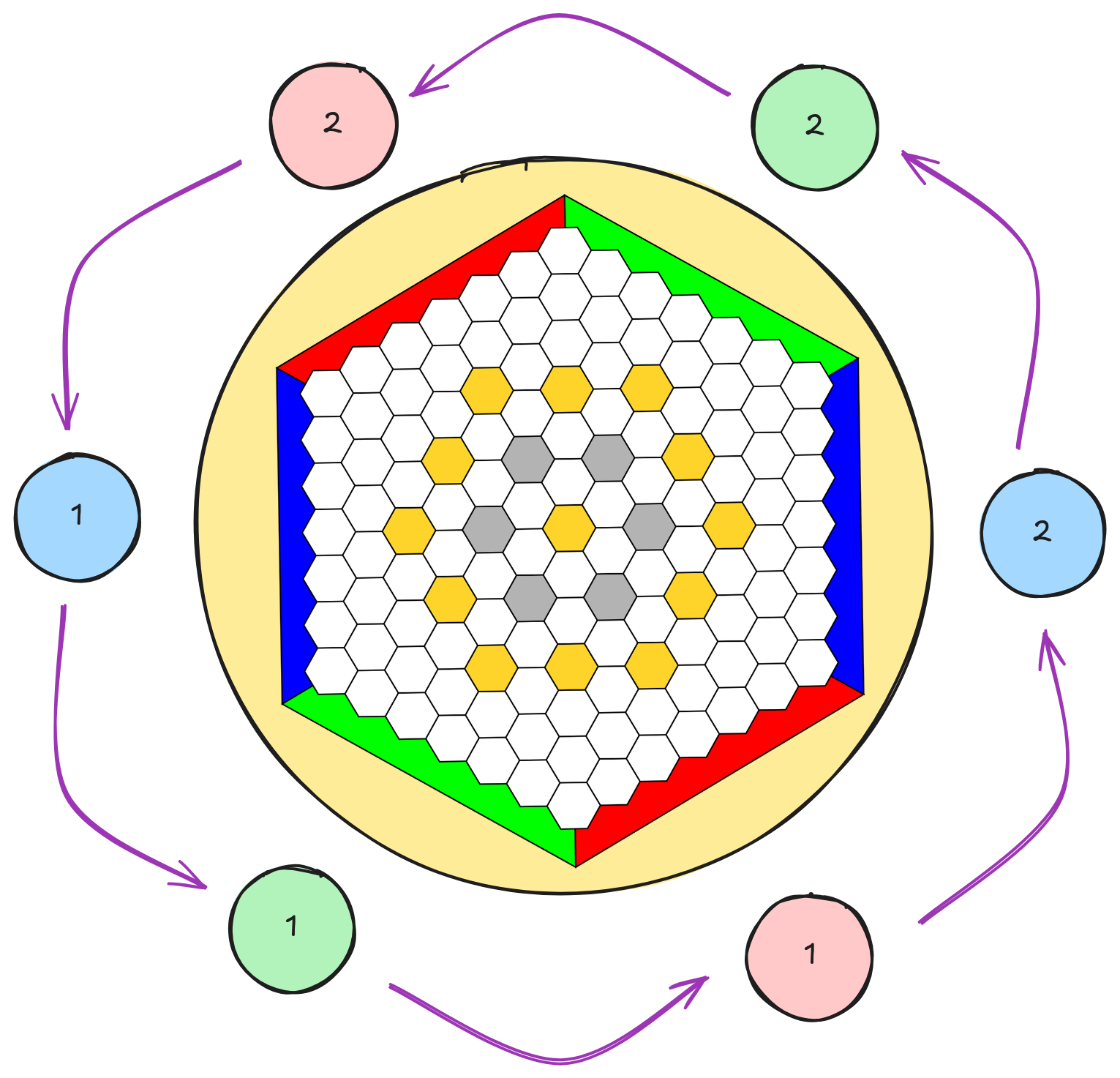 As for other game mechanic improvements, it could be possible that the board gets choked up quickly and even more so with three teams playing. I have some ideas of re-arranging the hexagons, with the only condition that the board has to have rotational symmetry so that the board is equal for every team.